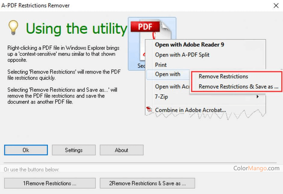 A-PDF Restrict Remover vous permet de supprimer le mot de passe et les restrictions en quelques secondes. Ce programme n'est pas un utilitaire de récupération de mot de passe, car vous n'avez pas besoin d'un mot de passe pour pouvoir supprimer les restrictions relatives aux documents !