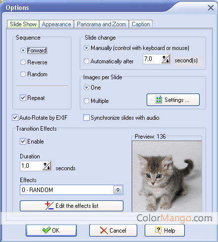 Caractéristiques de Able Photo SlideShow Formats d'image pris en charge, notamment tif, tiff, fax, gif, jpg, jpeg, jpe, pcx, bmp, dib, rle, ico, cur, png, wmf, emf, tga, targa, vda, icb, vst, pix, pxm, ppm, pgm, pbm. 250 effets de transition intégrés (avec aperçu). Supporte la fonction glisser-déposer