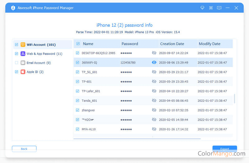 Trouvez, consultez et exportez tous les types de mots de passe enregistrés sur vos appareils iOS.