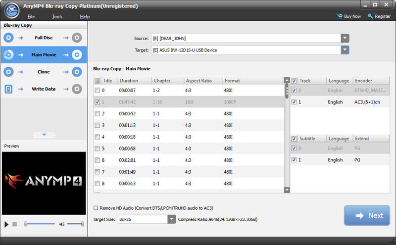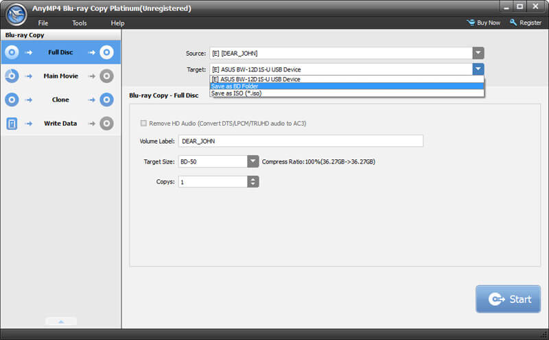 Si vous possédez de nombreux disques Blu-ray préférés et que vous souhaitez copier le contenu sur votre ordinateur pour le sauvegarder ou le regarder, voici une question : Comment copier des disques Blu-ray sur l'ordinateur ? AnyMP4 Copie Blu-ray donne une solution parfaite. Il permet à l'utilisateur de copier complètement un dossier Blu-ray ou un fichier ISO sur le disque dur de l'ordinateur. Il peut également aider les utilisateurs à copier n'importe quel disque Blu-ray 2D/3D sur un disque Blu-ray/un disque Blu-ray/un fichier image ISO Blu-ray. Ainsi, avec ce programme, vous pouvez facilement cloner un disque Blu-ray sur un disque Blu-ray dans un rapport 1:1 et compresser le BD-50 en un seul BD-25 d'excellente qualité.
