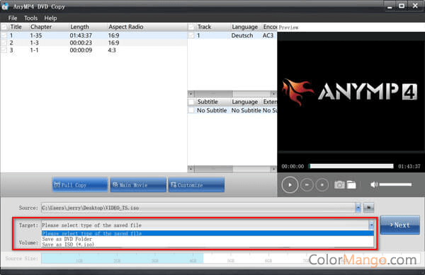 AnyMP4 DVD Copie Caractéristiques 1. Copier le DVD sous forme de fichier ISO ou de dossier sur un disque dur 2. Cloner un fichier image ISO ou un dossier DVD sur un DVD vierge 3. Compatible avec DVD + -R/RW, DVD-RAM, 4. Compatible avec la plupart des lecteurs DVD, graveurs DVD et disques double couche de 8,5 Go.