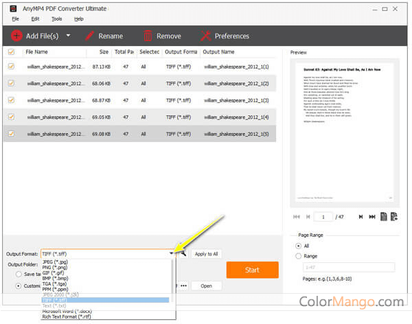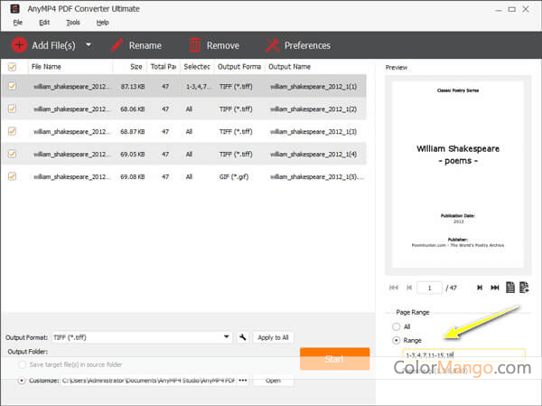 Regardez de plus près AnyMP4 PDF Converter Ultimate : 1. Convertissez des fichiers PDF en documents modifiables tels que du texte, Word, Excel, PowerPoint, ePub et HTML. 2. Convertissez des fichiers PDF en images telles que JPG, PNG, GIF, TIFF, etc. Les utilisateurs peuvent également définir sa taille, sa couleur et d'autres paramètres. 3. Technologie OCR avancée intégrée pour améliorer la précision et la stabilité de la reconnaissance et pour exporter des fichiers dans différentes langues. 4. Conversion par lots et à une vitesse supérieure 5. Exporte les plages de pages sélectionnées, la page en cours ou l'intégralité du PDF.