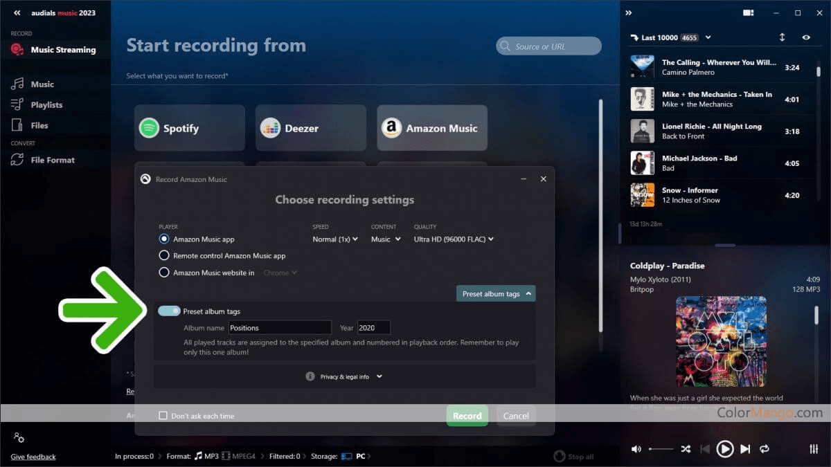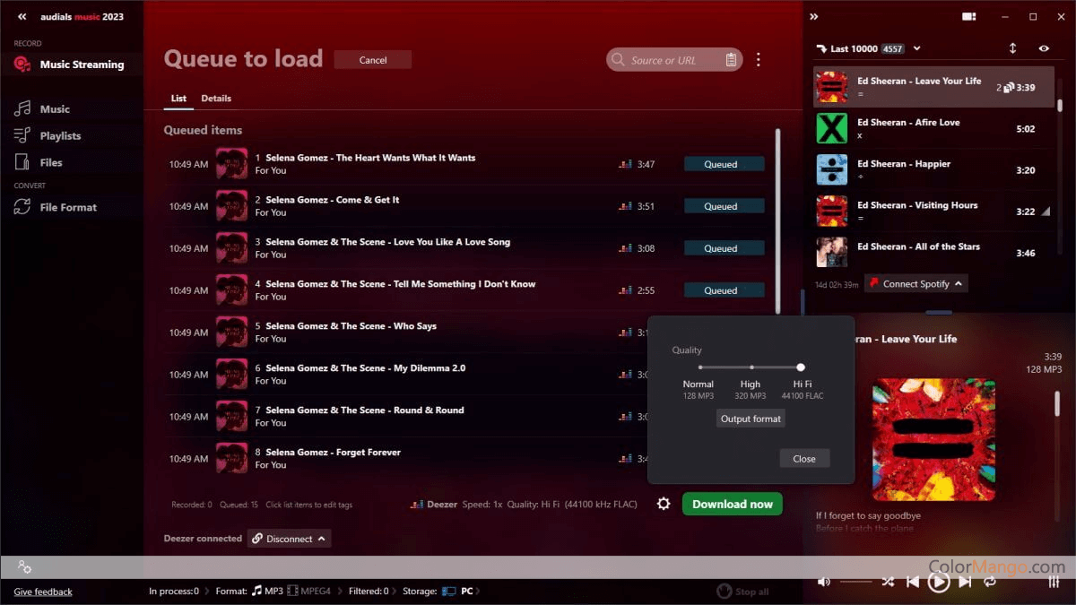 Audials Music permet d'enregistrer une qualité sonore haute définition, audio principal et haute fidélité sans perte de qualité. Il vous permet de choisir des formats audio à votre guise, tels que des formats standard tels que MP3, AAC et WMA, et des formats audio haute résolution tels que FLAC et WAV. Cela signifie qu'il peut enregistrer automatiquement la musique de qualité sans perte fournie par Tidal, Amazon et Deezer dans la plus haute qualité. En revanche, la musique provenant d'autres sources sera enregistrée dans des formats standard.