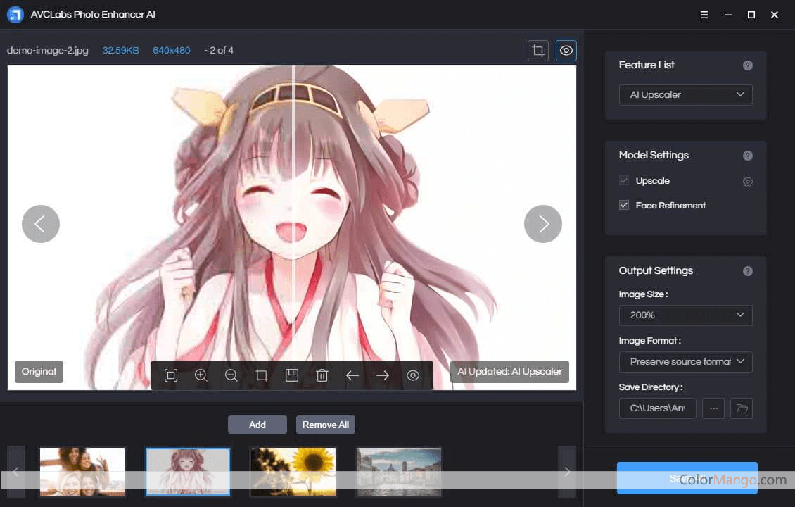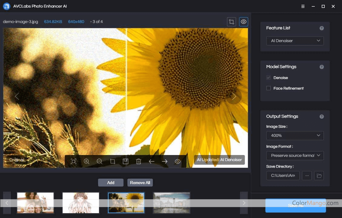 AVCLabas Photo Enhancer AI fournit un moyen rapide et facile d'améliorer la qualité de vos photos. Il applique la technologie de l'intelligence artificielle et utilise des modèles d'IA pour traiter les photos. Il peut réduire le bruit numérique, corriger les mauvaises couleurs, la balance des blancs et la netteté, corriger les images floues et réduire le bruit des photos. Ce programme d'IA d'amélioration des photos restaure la définition souvent perdue lors du processus d'imagerie numérique. Il peut vous aider à obtenir une reproduction naturelle des couleurs, des détails élevés et des photos de haute qualité.