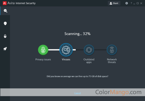 Avira Internet Security possède 4 fonctions principales : vérification du statut, sécurité, confidentialité et performances.