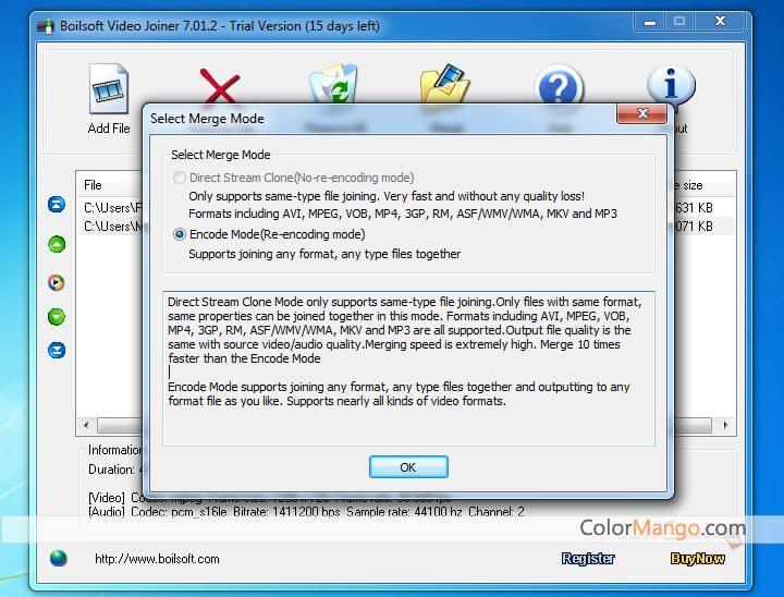 Boilsoft Video Joiner est un bon programme qui permet simplement de joindre des vidéos très rapidement et efficacement, sans avoir besoin de changer le format ou de convertir la vidéo. Comme pour les autres outils de montage vidéo, vous devez modifier les formats ou les propriétés de la vidéo, ce qui coûte vraiment beaucoup plus de temps et de processeur et parfois cette opération entraîne une perte de qualité. Boilsoft Video Joiner fonctionne exactement comme si vous combiniez des clips. C'est le menuisier le plus fonctionnel et le plus efficace que j'ai trouvé.Répondre