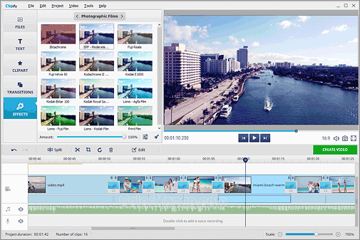 Clipify vous propose plus de 150 effets et filtres accrocheurs. Vous pouvez créer une délicieuse atmosphère rétro pour vos films grâce à des effets rétro, rendre vos matériaux en noir et blanc ou beige pour des effets plus tendance, recréer la palette de films célèbres ou de films d'art et ajouter du brouillard, des flammes, du soleil, des étincelles ou de la lueur en un seul clic.