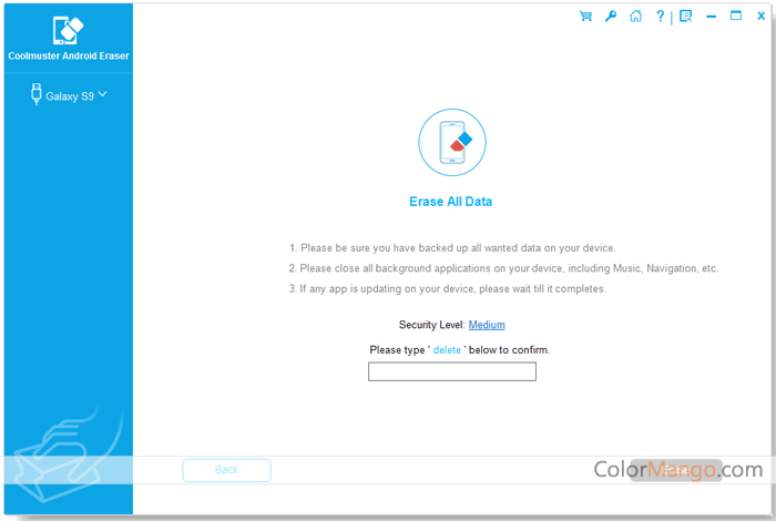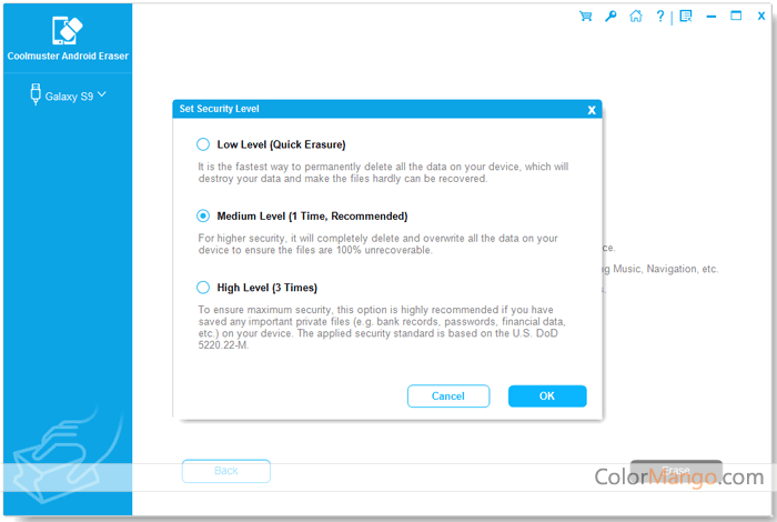 Coolmuster Android Eraser Caractéristiques 1. Effacez définitivement toutes les données de votre appareil Android, y compris les fichiers supprimés, les données privées, les paramètres système, etc. 2. Supporte divers fichiers Android, y compris les SMS, les contacts, les vidéos, les photos, la musique, les journaux d'appels, les applications, les livres, l'audio, les informations de compte, les mots de passe, etc. 3. Supprimé définitivement à 100% et empêche la récupération des données personnelles. 4. 3 niveaux progressifs d'effacement des données à choisir. 5. Applicable à tous les appareils Android.