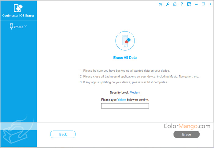 Lorsque vous comptez vendre, donner ou échanger vos anciens appareils iOS, vous feriez mieux de les nettoyer complètement, car cela pourrait entraîner une fuite d'informations. Afin de protéger vos données contre le vol sur vos anciens appareils iOS, je vous recommande ici d'utiliser Coolmuster iOS Eraser. Il a la capacité de supprimer tous les types de données sur vos appareils et ne promet aucune possibilité de récupération à partir d'un logiciel. Il vous suffit de connecter vos appareils iOS à votre ordinateur, de sélectionner un niveau d'effacement, puis d'appuyer sur le bouton « Démarrer ». Parce que son interface est si intuitive et simple, vous saurez directement quoi faire si vous ouvrez ce logiciel.