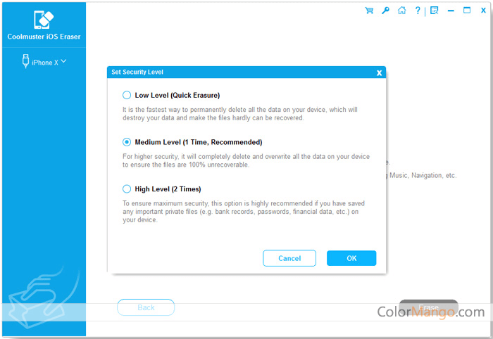 Regardez de plus près Coolmuster iOS Eraser : grâce à la technologie avancée de numérisation et de détection des données, Coolmuster iOS Eraser propose trois niveaux d'effacement : 1. Le niveau bas efface rapidement vos données ordinaires pour vous faire gagner du temps. 2. Le niveau moyen supprimera toutes les épaves de données traçables et réécrira tous les espaces de données existants et supprimés pour garantir qu'il ne reste aucune traçabilité. 3. Le niveau élevé est l'option la plus sûre pour réécrire deux fois toutes vos données afin qu'elles n'aient aucune possibilité de restauration.