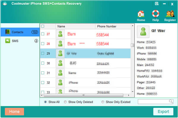 Regardez de plus près Coolmuster iPhone SMS + Contacts Recovery : 1. Récupérez les données perdues à partir d'appareils iOS directement et à partir de la sauvegarde iTunes avec une efficacité élevée. 2. Supporte la restauration des SMS et des contacts de l'iPhone, des pièces jointes, etc. 3. Capable de récupérer les informations jointes telles que le nom du contact, l'adresse, le titre du poste, l'entreprise, l'e-mail, etc. 4. Possibilité de récupérer vos données de manière sélective afin que vous soyez toujours celui qui a le droit de faire des choix. 5. Une technologie de pointe garantit une efficacité de récupération élevée et sans aucun dommage. 6. Récupérez vos données dans diverses situations, telles qu'un jailbreak incorrect, des dommages physiques, une réinitialisation à l'état d'usine, une attaque virale, etc. 7. Haute compatibilité avec tous les types d'appareils iOS.