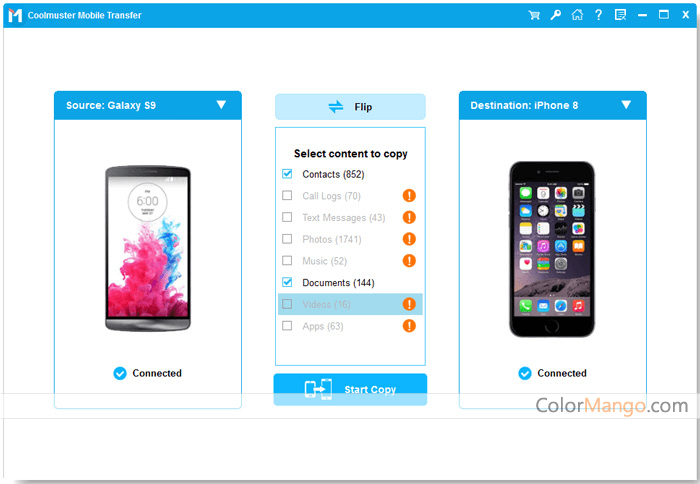 Fonctions Coolmuster Mobile Transfer 1. Transférer le carnet d'adresses de l'ancien téléphone portable vers le nouveau téléphone portable 2. Transférer les ressources multimédia des anciens téléphones mobiles vers le nouveau téléphone portable 3. Supporte le même type de transmission de données par téléphone portable ; par exemple, vous pouvez transférer des données d'Android vers Android 4. Vous pouvez transférer d'Apple vers un téléphone mobile Apple 5. Vous pouvez également transférer des données entre systèmes, d'iOS vers Android et de téléphones Android vers les téléphones Apple.