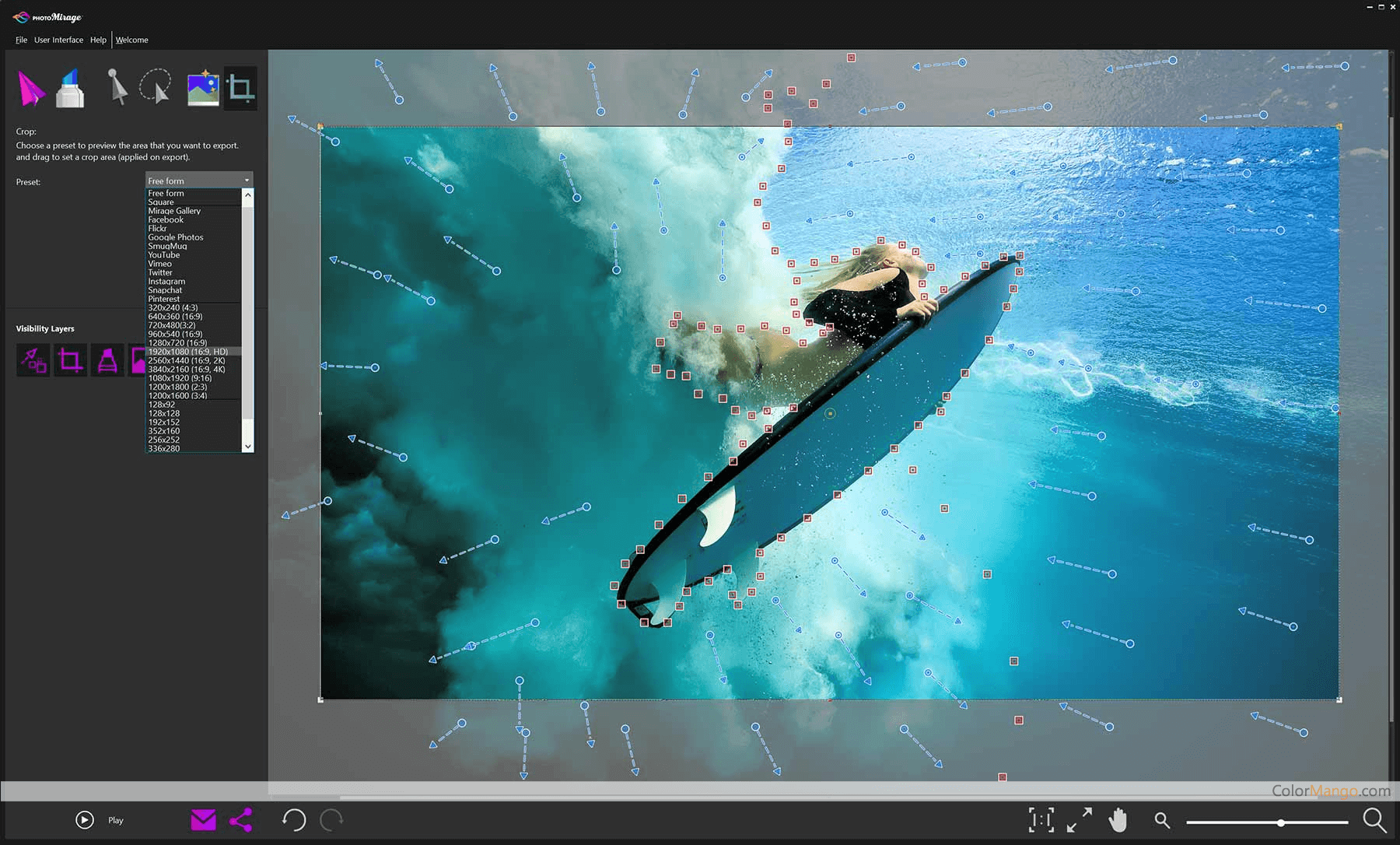 L'effet Corel PhotoMirage est similaire à Cinemagraph, mais au lieu d'utiliser la vidéo comme source, il crée une animation en déformant, en estompant et en bouclant des parties de l'image. Certains outils peuvent contrôler la direction de la déformation, isoler les zones qui ne doivent pas être affectées, recadrer les photos et exécuter des fonctions d'amélioration de l'image en un clic. Le résultat final peut être partagé avec les réseaux les plus populaires de l'application.