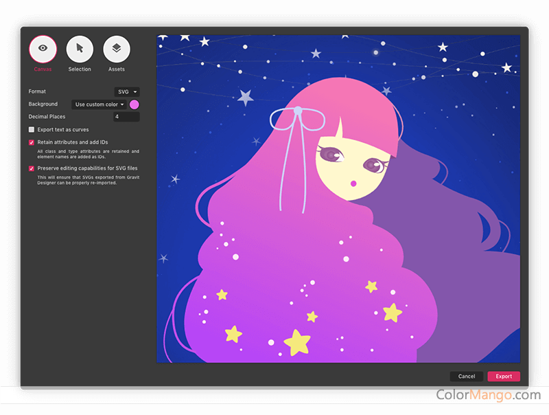 Corel Vector vous permet d'exporter des projets au format PDF, PNG, JPEG et SVG, et peut également vous aider à les imprimer à l'aide de n'importe quel support. De plus, Gravit Designer a ses propres atouts en termes de design de logo et d'illustration. Nous admettons qu'il n'est pas aussi puissant que les grands noms de l'industrie, mais il convient peut-être mieux à la grande majorité des utilisateurs de ce secteur.