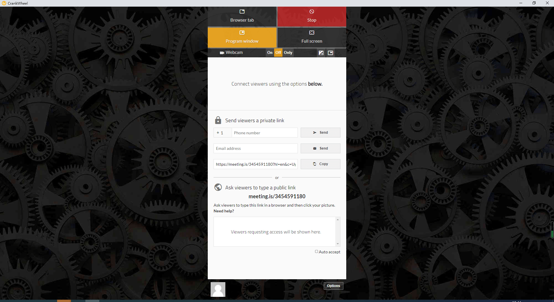 CrankWheel est un connecteur robuste à partir duquel vous pouvez présenter vos produits à vos clients en temps réel, répondre à leurs questions et résoudre leurs problèmes immédiatement. De plus, que vous travailliez dans un autre pays ou que vous soyez en voyage d'affaires, cela vous aidera à organiser des réunions avec vos collègues grâce au partage d'écran, au partage de webcam ou même à la prise de contrôle à distance d'ordinateurs. Ainsi, vous n'aurez plus à vous soucier de l'attention des gens, car tous les besoins des clients et les exigences des entreprises en matière de satisfaction disparaîtront grâce à la réponse la plus rapide de CrankWheel !