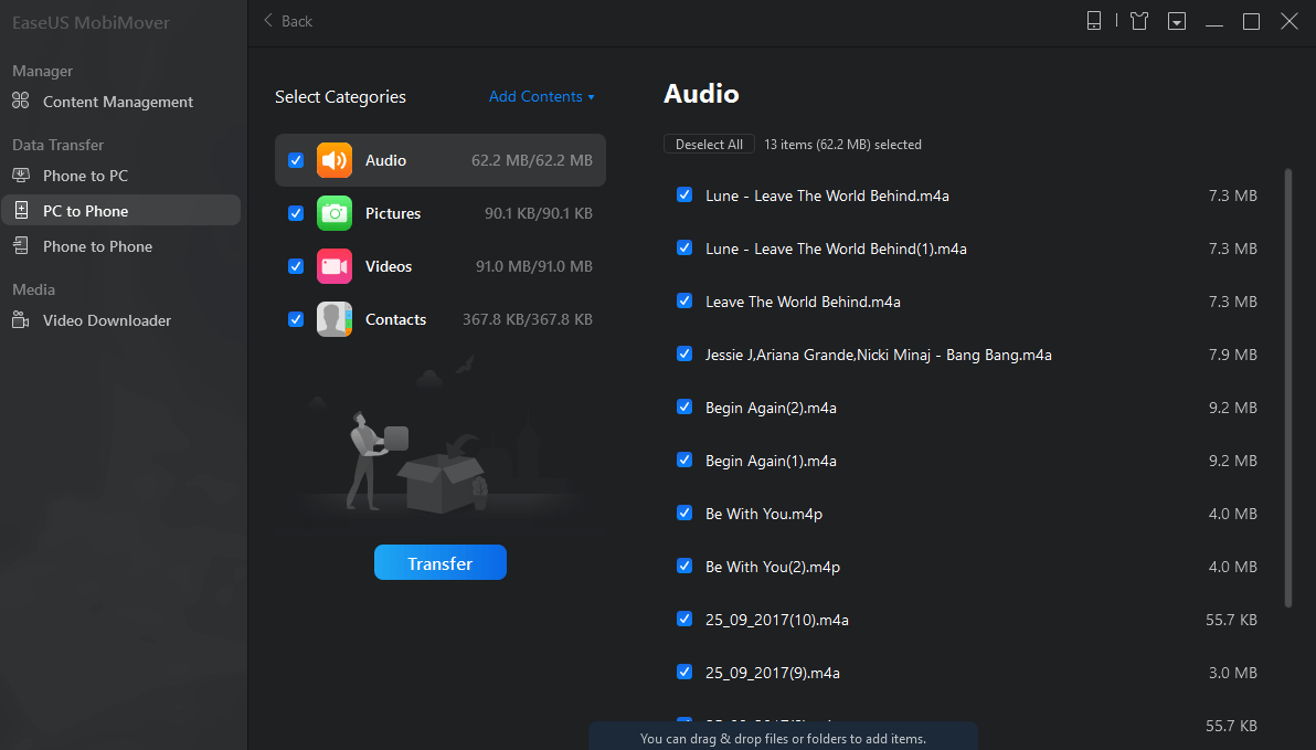 Le transfert de données EaseUS MobiMover est simple et pratique. Il vous suffit de connecter l'appareil, de sélectionner la fonction dans le transfert de données, puis de sélectionner le type de fichier que vous souhaitez transférer depuis/vers l'iPhone. De plus, vous pouvez sélectionner des fichiers ou plusieurs dossiers à transférer en même temps, puis confirmer et cliquer sur le bouton de transfert pour commencer !