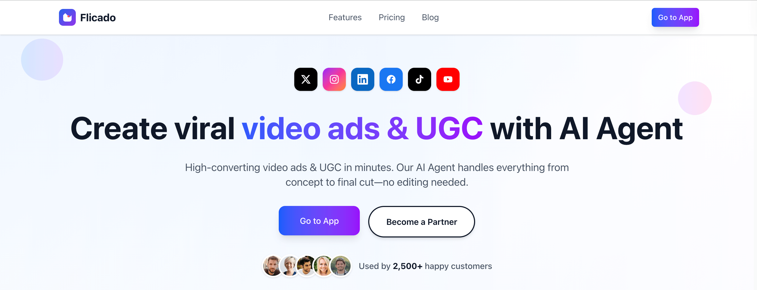 Flicado est une plateforme complète de création de publicités vidéo basées sur l'IA qui offre :