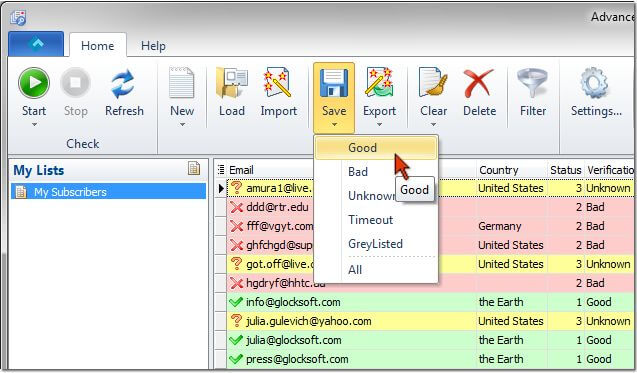 G-Lock Advanced Email Verifier peut vérifier chaque adresse e-mail si elle est toujours valide dans vos listes de diffusion. Il détecte les mauvaises adresses e-mail avec une précision de près de 100 %. Vous pouvez améliorer les performances de vos campagnes par e-mail grâce au chargement rapide des listes de diffusion tout en économisant de la bande passante et du trafic Internet. Il peut également vous permettre d'importer et d'exporter des listes de courrier électronique et des adresses depuis et vers Excel, Text, HTML, Word, Paradox, Lotus, dBase, etc.