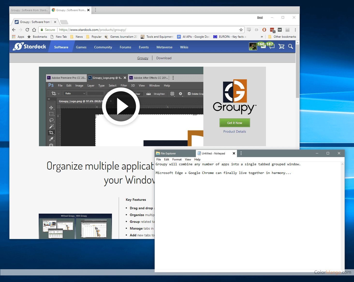 Groupy est une application logicielle développée par Stardock qui permet aux utilisateurs d'organiser plusieurs fenêtres en groupes d'onglets sur leur bureau Windows. Avec Groupy, les utilisateurs peuvent regrouper les fenêtres associées, telles que les navigateurs Web, les fenêtres de discussion et les applications de productivité, dans une interface à onglets unique et organisée.