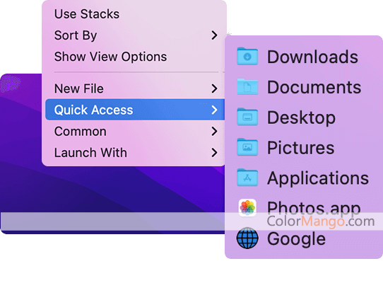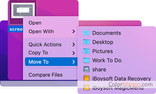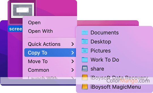 iBoysoft MagicMenu peut ajouter trois fonctions à votre menu contextuel : créer de nouveaux fichiers, accéder rapidement à des répertoires spécifiques et envoyer rapidement des fichiers vers un répertoire particulier. En outre, les emplacements et les types de fichiers peuvent être personnalisés.