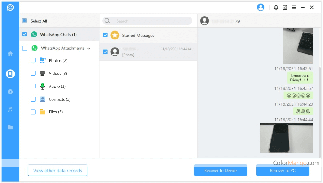 Supporte la récupération de divers formats de données WhatsApp, y compris les enregistrements de conversations, les photos, les films, la voix, les informations de contact, les documents, etc.