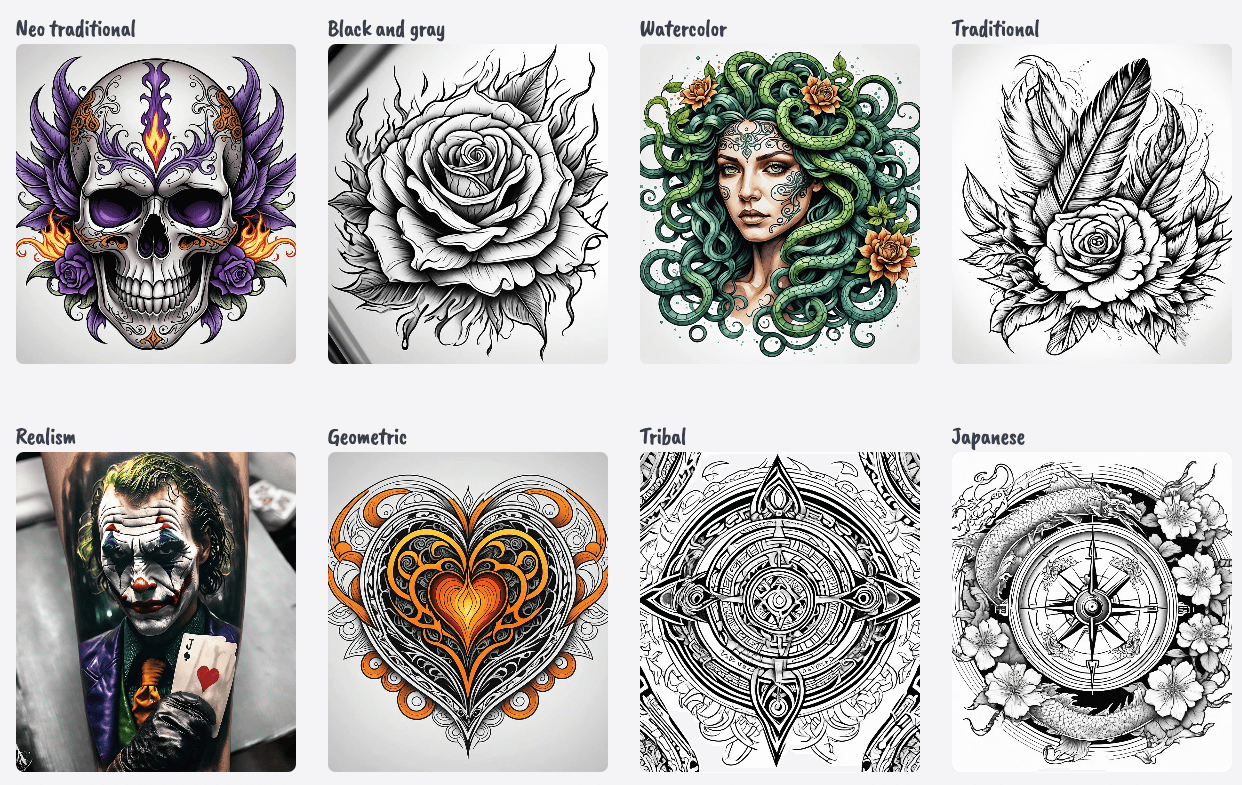 Large gamme de styles : prend en charge de nombreux styles de tatouage : néo-traditionnel, aquarelle, réalisme, géométrique, pointillé, tribal, etc.