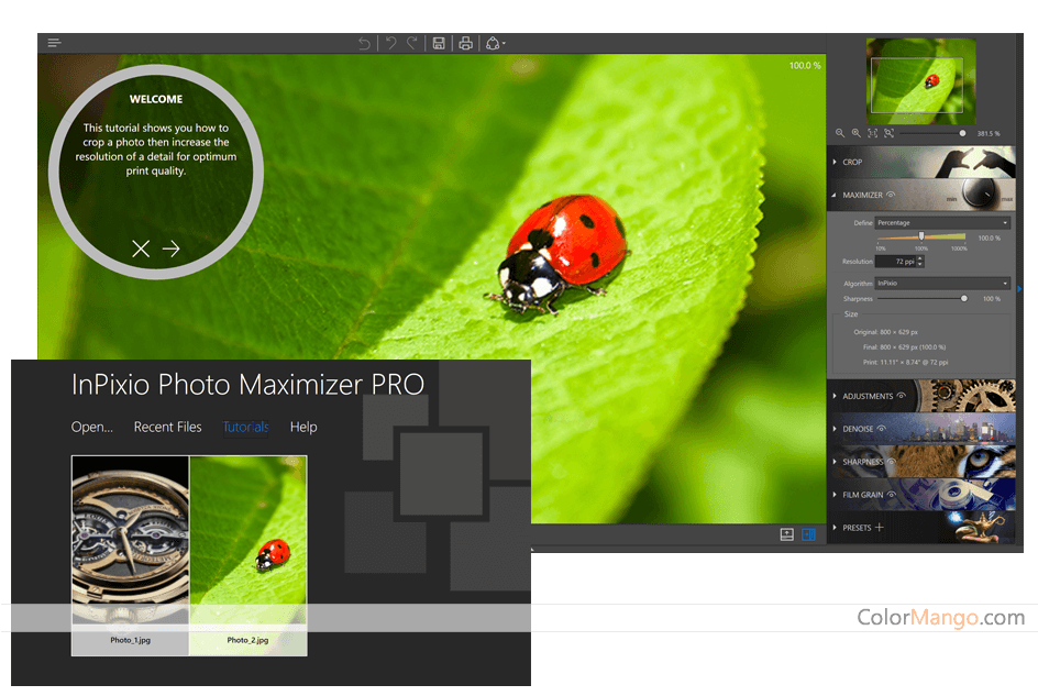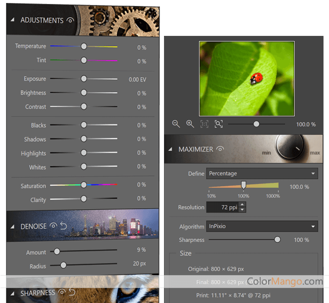 In addition, InPixio Photo Maximizer Pro has zoom options, cropping, photo adjustment, noise reduction, sharpness and movie texture features, and presets. Some pre-defined iPixIO Photo Maximizer profiles can be used to crop images quickly and set custom sizes and adjustment angles. When scaling with the Maximize tool, you can define percentage, long-edge, short-edge, megapixel, and other modes of scaling levels, set resolution, and select algorithms (iPixIO, Nearest Neighbor, Bilinear, Bicubic, Bicubic, Bicubic Sharpen, Bicubic Smooth, Lanczos). As far as photo adjustments are concerned, you can adjust the levels of temperature, hue, exposure, brightness, contrast, blacks, shadows, highlights, whites, saturation, and sharpness. Similarly, you can set the amount and radius when denoising an image to make it sharper or add film grain with the PIPIXIO Photo Maximizer.