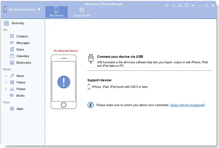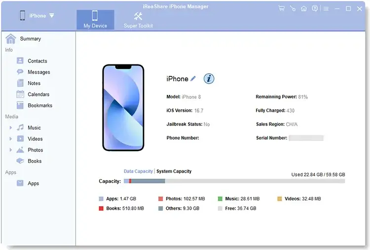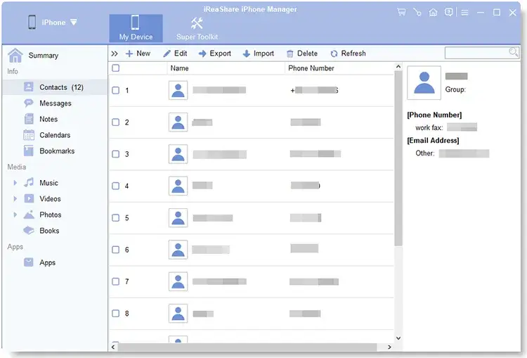 iReaShare iPhone Manager fournit des outils pour gérer les données iOS sur votre ordinateur. Il permet aux utilisateurs de transférer, sauvegarder et restaurer facilement des données telles que des photos, de la musique, des contacts, des messages et des applications entre un iPhone et un PC ou Mac. Le logiciel prend en charge une large gamme d'appareils iOS et dispose d'une interface conviviale permettant d'organiser les fichiers et d'effectuer des tâches de gestion des données en un clic. Il est idéal pour les utilisateurs qui souhaitent sauvegarder les données de leur iPhone ou gérer des fichiers efficacement sans utiliser iTunes.