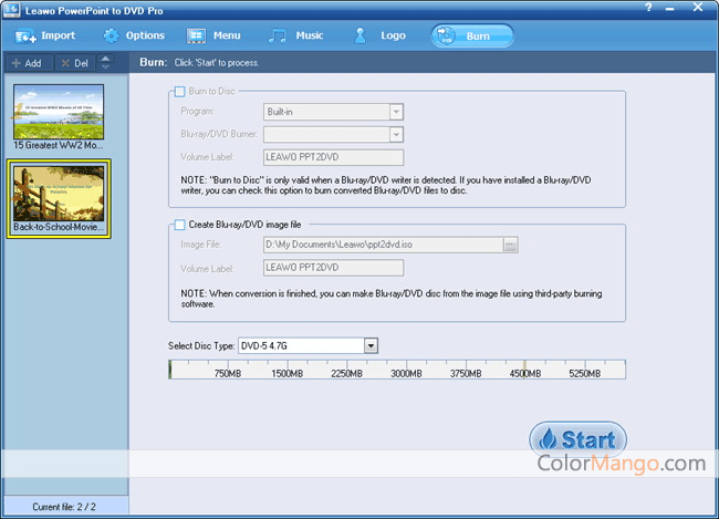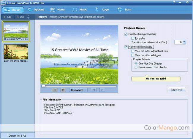 Leawo PowerPoint à DVD Pro est un logiciel PPT vers DVD professionnel, efficace et facile à utiliser. Il peut convertir des présentations PowerPoint en films et vidéos DVD ou Blu-ray tout en conservant toutes les animations, sons, transitions, clips vidéo et liens internes d'origine.