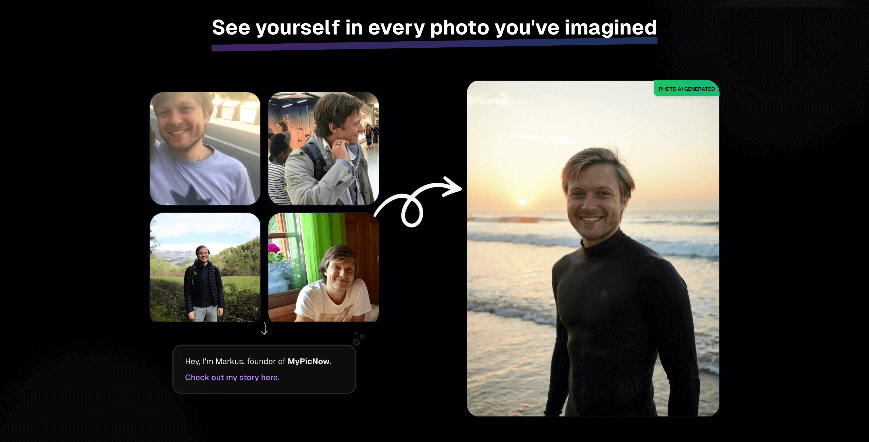 MyPicNow est une plateforme de génération d'images alimentée par l'IA qui transforme les photos des utilisateurs en portraits de qualité professionnelle.