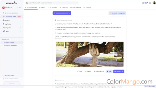 *Accédez à plus de 100 outils et modèles d'IA qui vous aideront à planifier, créer, optimiser et réutiliser votre contenu. Et si cela ne suffit pas, vous pouvez même créer vos propres modèles d'IA. *AI Content Genie qui génère automatiquement de nouveaux articles sur les réseaux sociaux et les blogs en fonction de l'URL ou des thèmes de votre site Web, semaine après semaine. * Une vaste collection d'images et de GIF libres de droits de haute qualité, ainsi qu'un générateur d'images IA pour créer des images personnalisées rien que pour vous. *Publication et planification automatisées sur WordPress, Webflow, LinkedIn, Facebook ou Instagram en quelques clics. *Intégrations personnalisées faciles avec n'importe quelle plateforme à l'aide de l'API de Narrato ou de Zapier. *Un espace de travail complet pour la création, la collaboration et la gestion de contenu, qui permet de gérer les créateurs indépendants, les agences et les autres parties prenantes en un seul endroit. *Une expérience personnalisée avec des flux de travail personnalisés, des modèles de contenu et des fonctionnalités d'automatisation qui répondent à vos besoins uniques.
