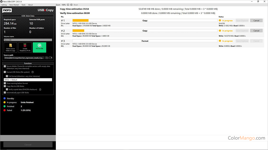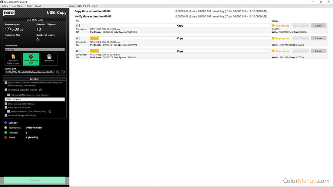 Il vous permet de spécifier la source ou le chemin des données à copier, et il est capable de démarrer le processus de copie et de formater les périphériques en FAT32, NTFS ou exFAT en même temps. Autre avantage, Nero USBxCopy peut vérifier chaque appareil et afficher l'état de la copie en couleur, afin que vous ne perdiez pas la trace du nombre de copies terminées. En outre, il éjectera automatiquement les appareils terminés, ce qui le rend plus pratique.