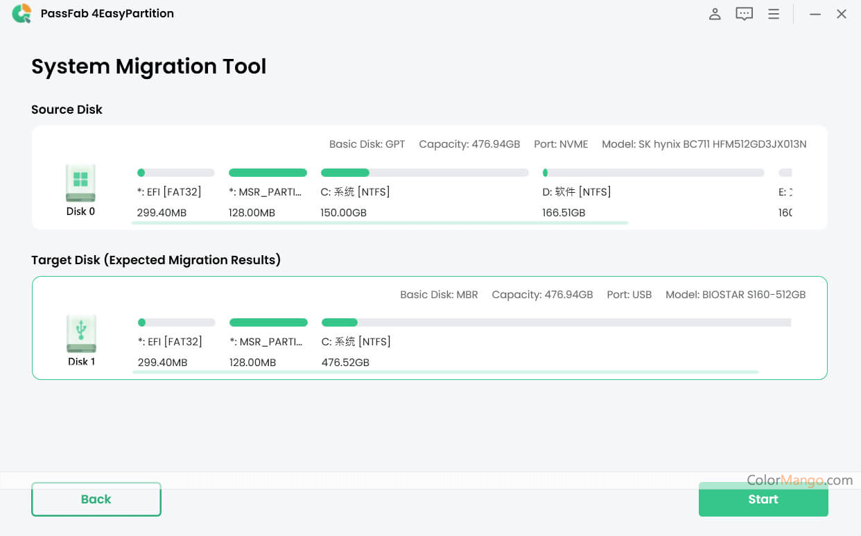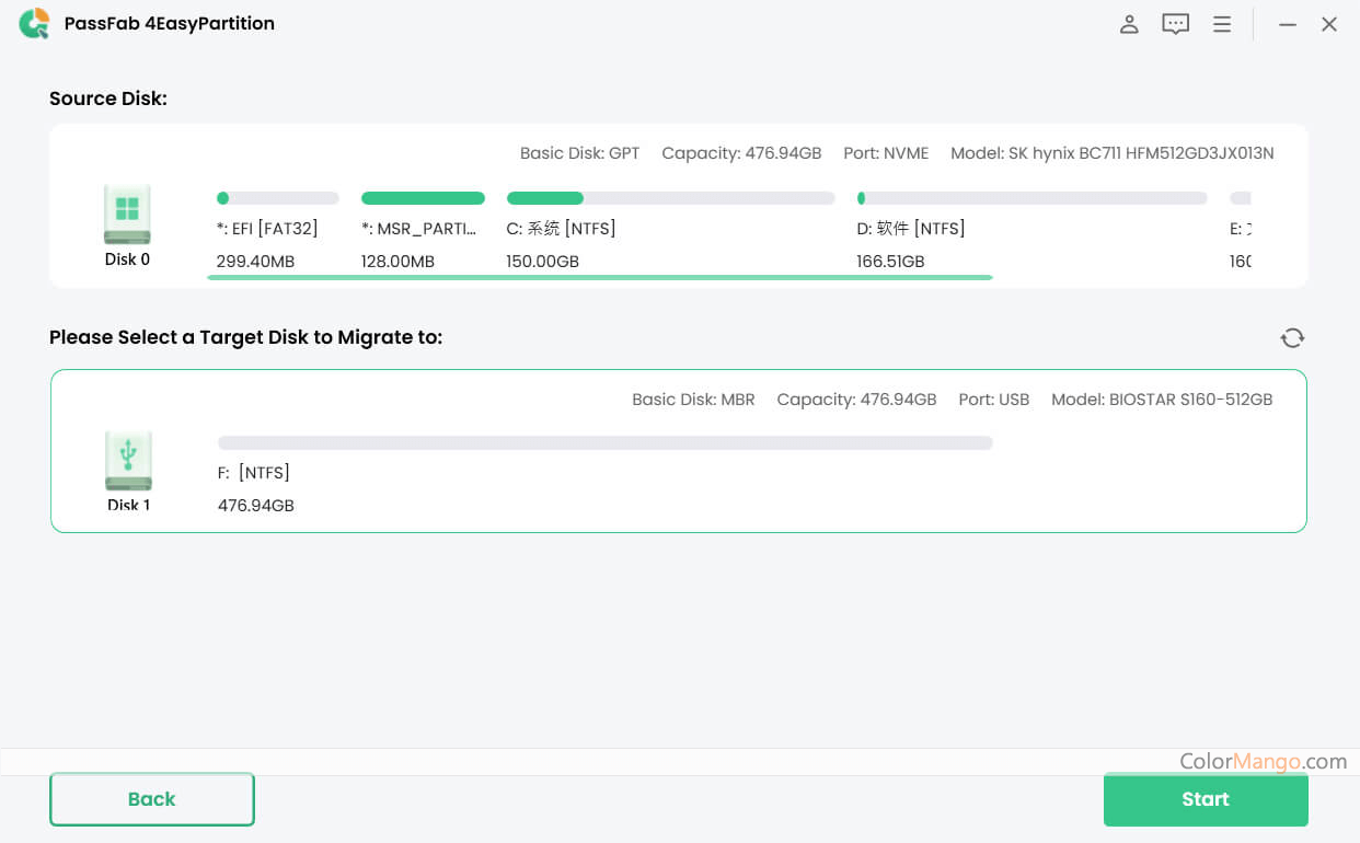 PassFab 4EasyPartition peut réaliser une migration en un clic, vous n'avez donc pas besoin de passer des heures à réinstaller le système d'exploitation et les applications pour transférer des données directement ou réinstaller les applications. Améliorez l'efficacité et gagnez du temps. Lorsque les utilisateurs migrent leurs systèmes vers un système d'exploitation plus efficace, assurez-vous que les activités ne seront pas interrompues. L'installation d'applications, de fichiers de configuration système et d'autres fichiers n'est pas nécessaire. Migrez efficacement et en toute sécurité vos données, votre système d'exploitation et vos applications vers un autre disque dur sans perte de données. Migrez les données vers un nouveau disque plus grand. Résolvez efficacement le problème de l'espace disque insuffisant, accélérez votre ordinateur et faites-le fonctionner plus rapidement. Le remplacement du disque dur par un SSD vous offre la méthode de démarrage la plus simple et la plus rapide. L'interface intuitive et l'assistant étape par étape permettent de migrer le système en quelques étapes seulement.
