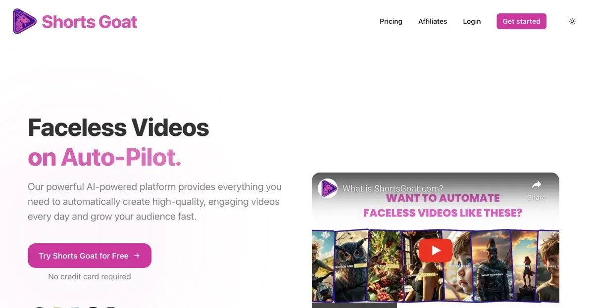 ShortsGoat cible les nouveaux créateurs, les créateurs expérimentés, les chefs d'entreprise, les spécialistes du marketing et tous ceux qui cherchent à simplifier la création de contenu vidéo. Les utilisateurs choisissent un sujet et ShortsGoat gÚre l'idéation, les scripts, la production vidéo (y compris les visuels, la narration et les sous-titres) et la planification/la publication sur les comptes de réseaux sociaux connectés.