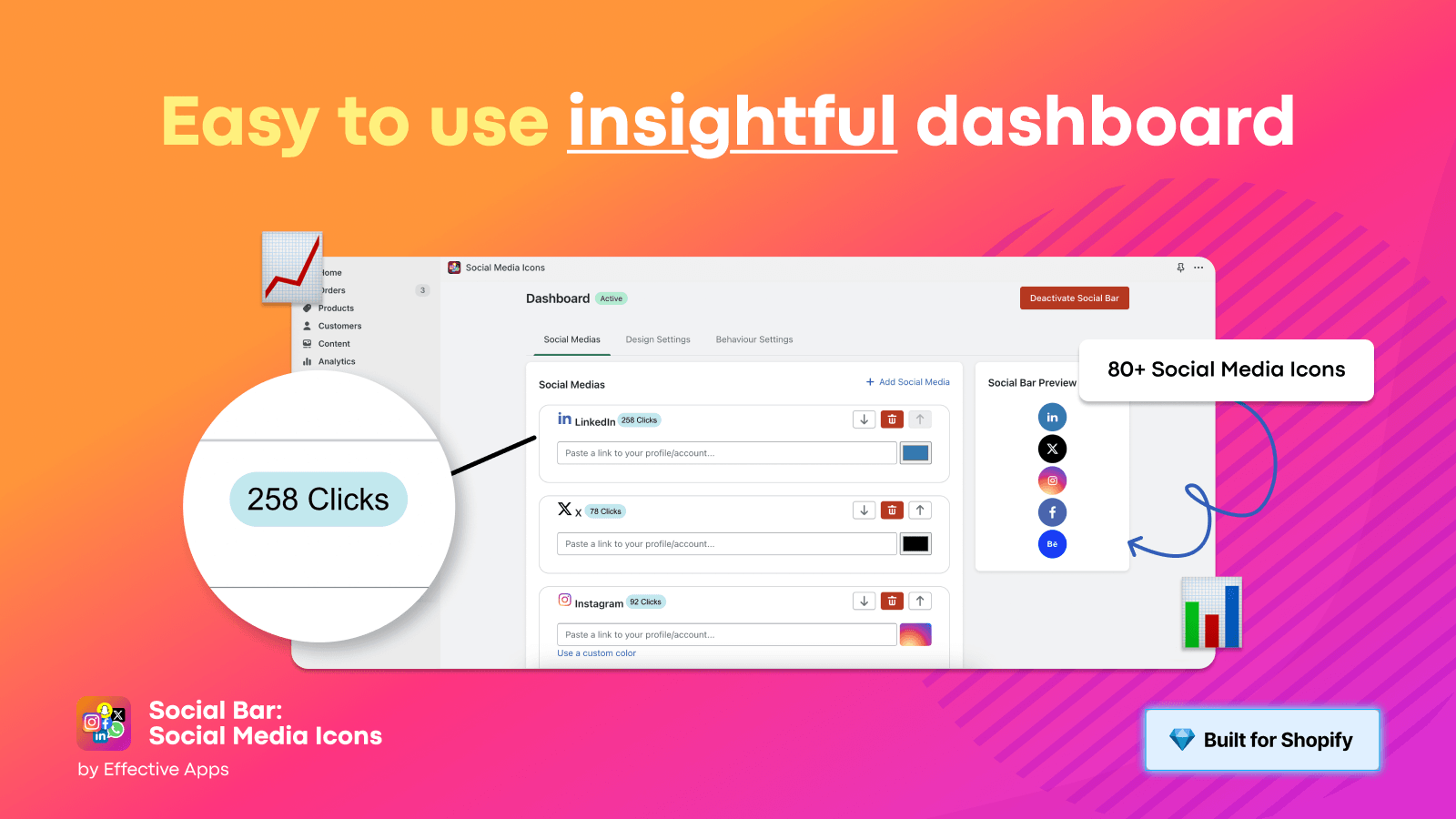 Ajoutez une barre flottante de plus de 80 icônes de profil social et de partage à vos pages de produits en un clic pour renforcer la preuve sociale et le suivi.