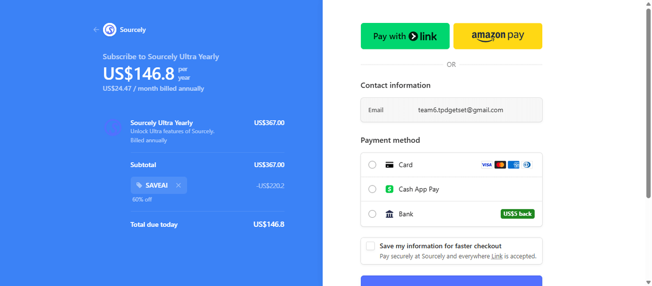 • Il n’y avait pas de réductions supplémentaires pour Sourcely pendant le Black Friday/Cyber Monday 2025.
