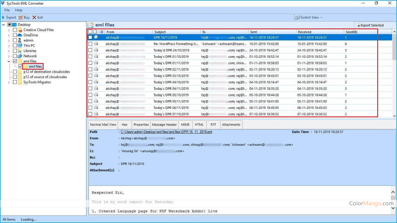 Exportez plusieurs fichiers EML au format HTML, PDF, MHT, TXT