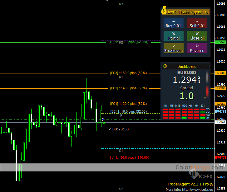 TraderAgent est l'assistant ultime du trader. Toutes les informations importantes sont affichées sur le graphique, il vous suffit donc d'ouvrir la position en un seul clic. La gestion de la position ouverte est aussi simple que possible : à l'aide de votre souris ou de votre pointeur, vous pouvez facilement ajuster les niveaux de stopploss et de Take Profit par glisser-déposer. Ensuite, TraderAgent fonctionnera pour vous en tant que solution de gestion des positions. Grâce à son interface graphique conviviale, n'importe qui peut rapidement apprendre à utiliser TraderAgent avec succès pendant le daytrade.