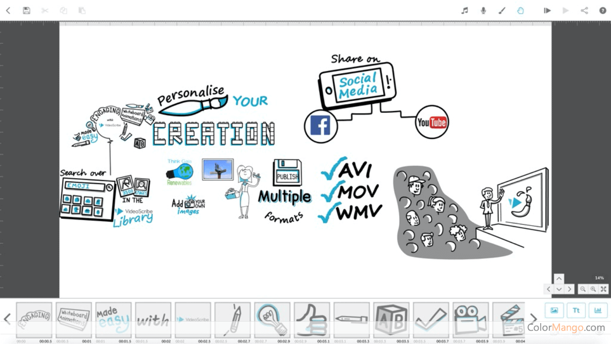 VideoScribe est un logiciel de création vidéo unique, qui crée des animations ou des vidéos fascinantes rapidement et facilement à la main. Grâce à cette opération simple, vous pouvez facilement ajouter des objets multimédia à vos œuvres de création, tels que des mots manuscrits, des images, des photos, une musique de fond, une narration, etc. Vous pouvez utiliser VideoScribe pour créer de superbes CV animés, des publicités d'intérêt public, des vidéos marketing, des démonstrations pédagogiques, etc. VideoScribe vous aidera à contrôler votre créativité et à créer des vidéos d'animation impressionnantes et profondes dessinées à la main.