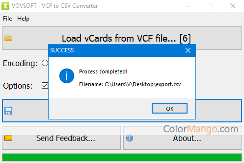 __ResName_0__T vous permet de convertir des fichiers au format VCF (vCard) au format CSV (valeurs séparées par des virgules). Cette conversion peut être utile pour transférer des informations de contact d'un appareil ou d'une application à un autre. Le logiciel fournit une interface simple et conviviale pour sélectionner le fichier VCF d'entrée et spécifier l'emplacement du fichier CSV de sortie.