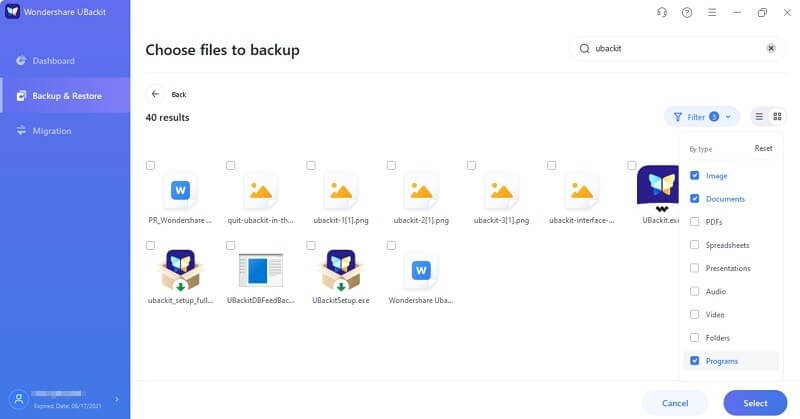Wondershare UBackit peut sauvegarder vos données essentielles de manière automatique, par exemple tous les jours, toutes les semaines, tous les mois ou sans interruption. Vous pouvez configurer la sauvegarde sans effort en deux clics. Il vous permet de filtrer les fichiers de sauvegarde par mot clé, type de fichier, extension ou de la manière que vous préférez. Wondershare UBackit prend en charge tous les types de fichiers courants, tels que les documents, les photos, les vidéos, les fichiers audio, les programmes, etc.
